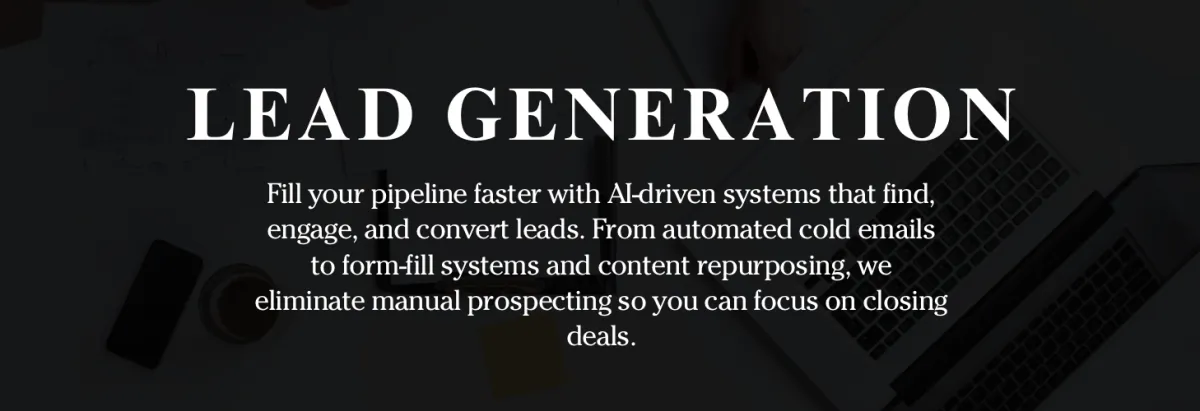 Fill your pipeline faster with AI-driven systems that find, engage, and convert leads. From automated cold emails to form-fill systems and content repurposing, we eliminate manual prospecting so you can focus on closing deals.