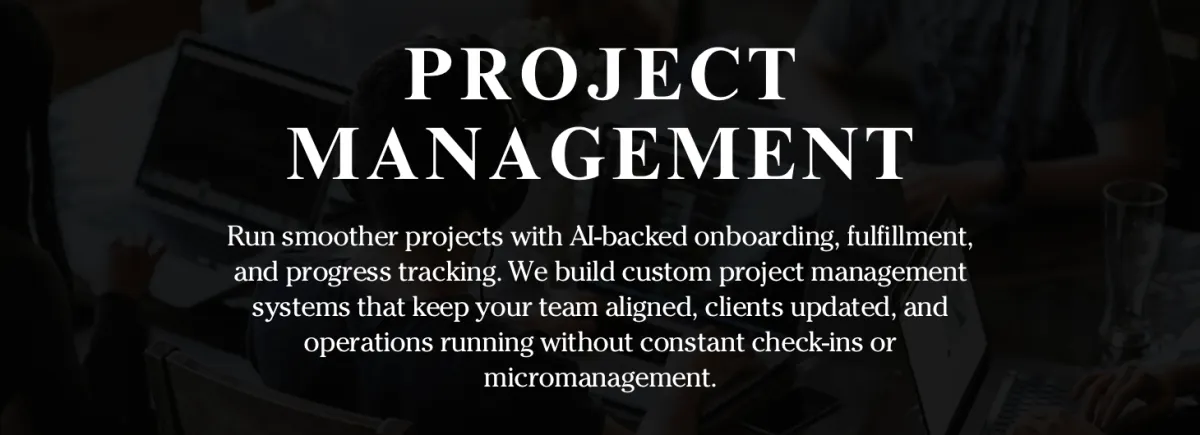 Run smoother projects with AI-backed onboarding, fulfillment, and progress tracking. We build custom project management systems that keep your team aligned, clients updated, and operations running without constant check-ins or micromanagement.
